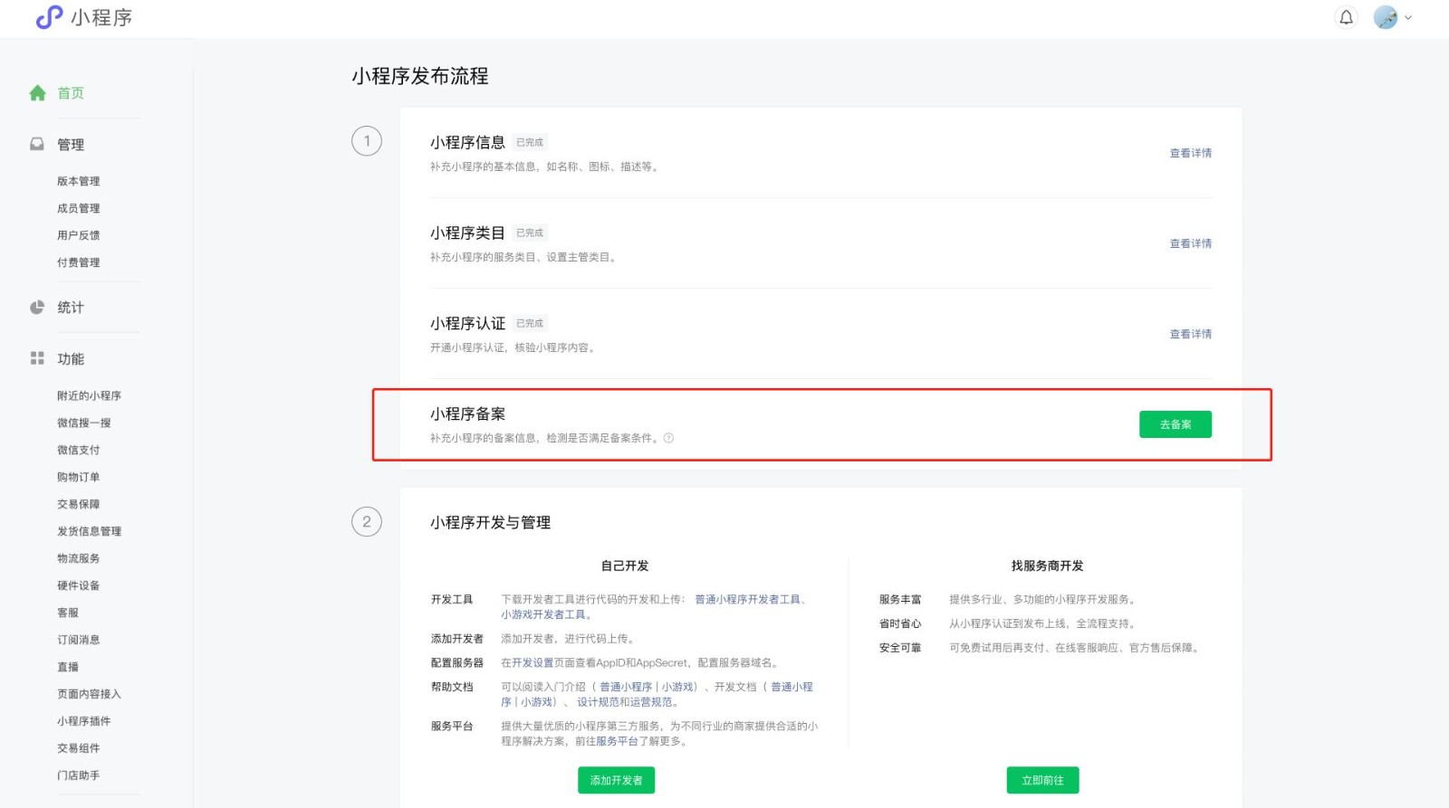 開(kāi)發(fā)者可在小程序首頁(yè)點(diǎn)擊【去備案】即可進(jìn)入備案流程