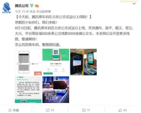 騰訊官方微博宣布,騰訊乘車(chē)碼在北京公交試運行上線(xiàn),目前騰訊乘車(chē)碼支持通州、昌平、順義、密云、大興、平谷等區域500余條公交線(xiàn)路5000余輛公交車(chē)。