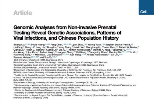 發(fā)表于《細胞》的這次成果, 是華大研究團隊在大規模人群隊列研究的一次嘗試, 取得顯著(zhù)的成果。研究小組攻克包括方法學(xué)在內的種種難題,開(kāi)發(fā)了適用于此類(lèi)數據的分析方法和算法,并希望由此建立一套基于超低深度測序數據進(jìn)行組學(xué)大數據研究的方法和策略,進(jìn)一步發(fā)揮 NIPT 數據的價(jià)值,最終在《細胞》發(fā)表了題為《無(wú)創(chuàng )產(chǎn)前基因組學(xué)研究揭示多種復雜性狀的遺傳關(guān)聯(lián),病毒感染模式以及中國人群體歷史》的研究成果。