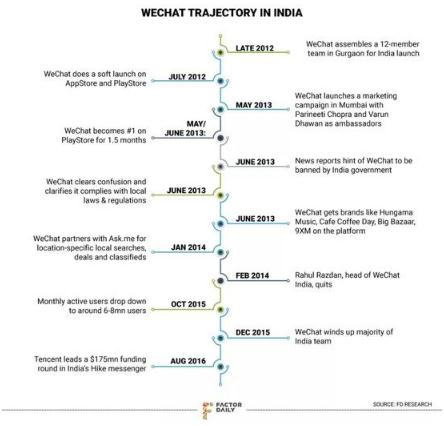 2013年,當微信在印度最活躍的時(shí)候,有新聞報道稱(chēng)印度政府計劃封殺微信。一名不愿透露姓名的微信前高管透露,“在謠傳政府將封殺微信之后,微信的衰退就開(kāi)始了。很多人在這之前甚至都不知道微信是中國的應用,他們看到的只是Varun Dhawan和Parineeti Chopra給微信做的宣傳。”