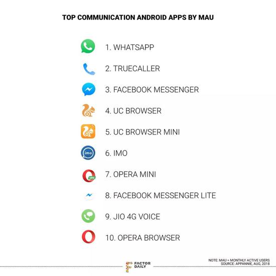 在最初的圈地時(shí)代結束后,各個(gè)產(chǎn)品或者找到了自己的位置,或者退出了印度市場(chǎng),除了已經(jīng)擁有一些市場(chǎng)的WhatsApp之外。