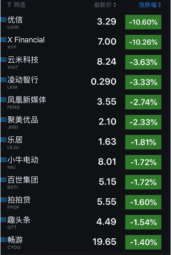 另一方面,跌幅較大的公司包括:優(yōu)信(跌 10.60%)、小贏(yíng)科技(跌 10.26%)、云米科技(跌 3.63%)、凌動(dòng)智行(跌 3.33%)、鳳凰新媒體(跌 2.74%)、聚美優(yōu)品(跌 2.33%)。