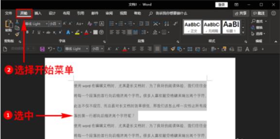 打開(kāi)后,我們選中文檔中需要第一行向后縮進(jìn)兩個(gè)字符的所有文檔,然后在頂部的菜單欄中找到并點(diǎn)擊“開(kāi)始”菜單。