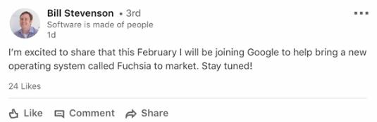 據外媒報道,谷歌已經(jīng)聘請了有著(zhù) 14 年經(jīng)驗的資深工程師 Bill Stevenson 來(lái)操盤(pán) Fuchsia,目標是推向成熟市場(chǎng)。