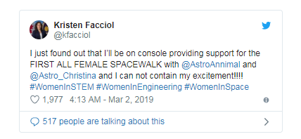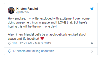 “天吶,我的 Twitter 評論沸騰了,因為都對女性將在太空中做出的令人敬畏的事情感到興奮,我對此很喜歡,”Facciol 后來(lái)寫(xiě)道。“但是我希望未來(lái)有一天這能成為常態(tài)!”