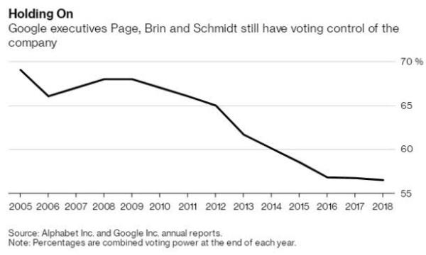 佩奇和布林進(jìn)一步退出了人們的視野和公司的日常運營(yíng)。施密特于 2018 年初辭去了執行主席的職務(wù)。同時(shí),根據 Alphabet 最新的年度報告,他們仍然控制著(zhù)該公司,持有 56.5% 的投票權。