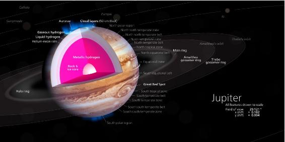 木星的構造。中心的巖核被一層液態(tài)金屬氫包圍。