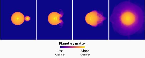 45 億年前,一顆質(zhì)量約為 10 倍的原行星很可能迎面撞上年輕的木星。在這張模擬圖中,從左到右,可以看到撞擊以及后果。