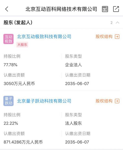 其中,北京互動(dòng)極致科技有限公司為互動(dòng)百科第一大股東,持股 77.78%;北京量子躍動(dòng)科技有限公司持股 22.22%,為互動(dòng)百科法人股東。