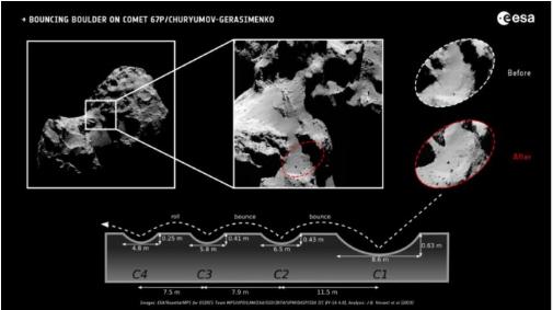 在連接啞鈴形 67P 的兩個(gè)葉片的“頸部”區域尤其如此,其中一塊 10 米(33 英尺)的巨石從懸崖上掉下來(lái)并在最終落下前反彈幾次。