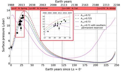 1988 年至 2238 年冥王星表面的大氣壓力隨時(shí)間的變化,洋紅色曲線(xiàn)為南半球存在氮儲集層的情況