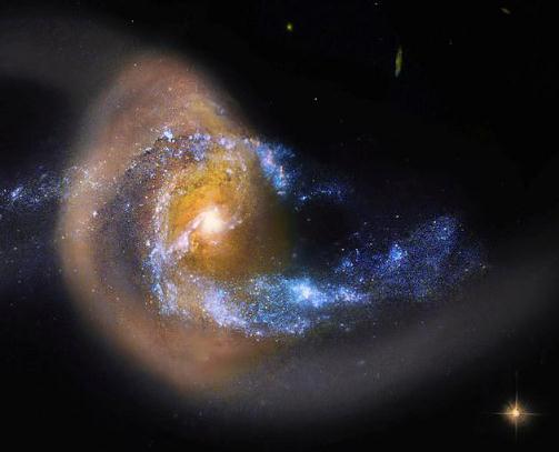 這兩個(gè)星系大約在 1 億至 2 億年前開(kāi)始相互糾纏、逐漸改變對方的形狀。漸漸地,它們之間出現了一座由恒星構成的“橋”,包括一個(gè)環(huán)和兩條長(cháng)長(cháng)的“尾巴”。這座“橋”就像一根管道,將較小星系的物質(zhì)源源不斷地送往較大的星系。有了這些材料補給,星系中央得以大量形成新的恒星,因而顯得十分明亮。
