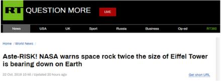 RT稱(chēng),雖然該小行星撞擊地球的風(fēng)險很低,但是也有很小幾率發(fā)生“雅科夫斯基”效應,即太陽(yáng)光的熱能會(huì )引導小行星偏離其當前軌道,這也許會(huì )使這顆小行星更靠近地球。
