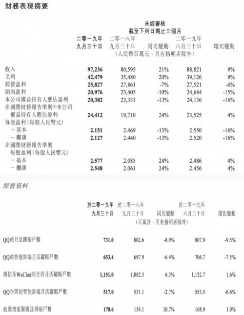 11 月 13 日消息,騰訊控股今日發(fā)布了截至 2019 年 9 月 30 日的第三季度未經(jīng)審計財報,財報顯示,騰訊第三季度總營(yíng)收 972.36 億元(137.48 億美元 ),同比增長(cháng) 21%;期內盈利 209.76 億元,同比下滑 10%,本公司權益持有人應占盈利為 203.82 億元,同比下滑 13%;按非國際財務(wù)報告準則,公司權益持有人應占盈利為 244.12 億元(34.51 億美元),同比增長(cháng) 24%。