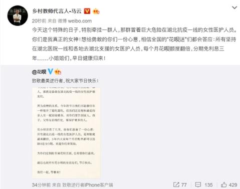 3 月 8 日消息,繼給援助湖北醫護人員送奶茶,炸雞、小龍蝦之后,今天馬云轉發(fā)微博,表示要給在湖北一線(xiàn)的女醫護群體花唄額度翻倍和 3 年分期免息。
