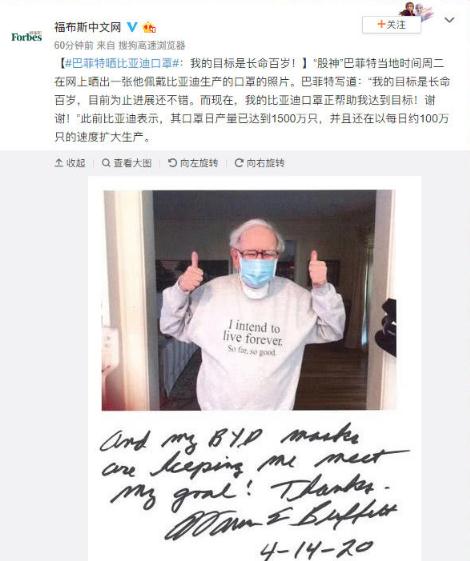 巴菲特寫(xiě)道:“我的目標是長(cháng)命百歲,目前為止進(jìn)展還不錯。而現在,我的比亞迪口罩正幫助我達到目標!謝謝!”