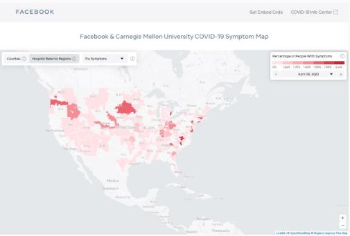 Facebook 與卡內基梅隆大學(xué)合作,推出了一張新的互動(dòng)地圖,幫助人們及時(shí)了解冠狀病毒在美國各地的傳播情況。目前來(lái)看,該地圖是基于在美國全國各地進(jìn)行的調查數據得出,它可以讓用戶(hù)看到有多少人正在經(jīng)歷與該疾病相關(guān)的癥狀。該地圖目前只覆蓋了美國,但計劃不久后將擴大到其他國家。