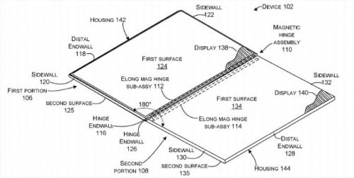 微軟在文件中透露了如何是使用細長(cháng)磁鉸鏈將兩個(gè)顯示屏組裝到一個(gè)雙屏硬件中進(jìn)而使其能夠同步、旋轉并模塊化的。