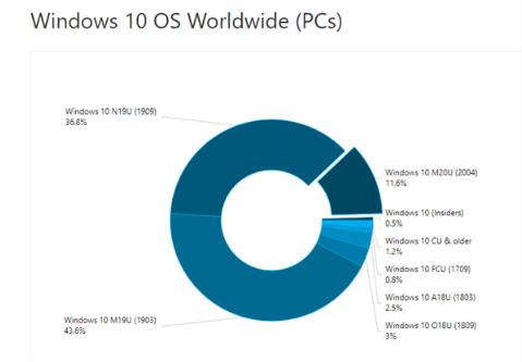 具體來(lái)說(shuō),Windows 10 版本中,v1903 依然是占比最高的,達到了 43.6%,而 v1909 緊隨其后,占比為 36.8%,這兩個(gè)版本總比例超過(guò) 80%,v2004(5 月更新)發(fā)布兩個(gè)月以來(lái),所占份額僅為 11.6%,比一個(gè)月前艱難提升 4.6%。