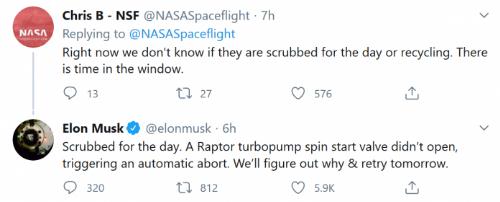 大約 45 分鐘后,馬斯克宣布嘗試失敗,并指出“Raptor 渦輪泵旋轉啟動(dòng)閥未開(kāi)啟導致發(fā)生中斷。”馬斯克同時(shí)放言:"我們會(huì )找出原因,明天再來(lái)!”