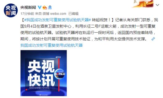央視表示,記者從有關(guān)部門(mén)獲悉,我國 9 月 4 日在酒泉衛星發(fā)射中心,利用長(cháng)征二號F運載火箭,成功發(fā)射一型可重復使用的試驗航天器。