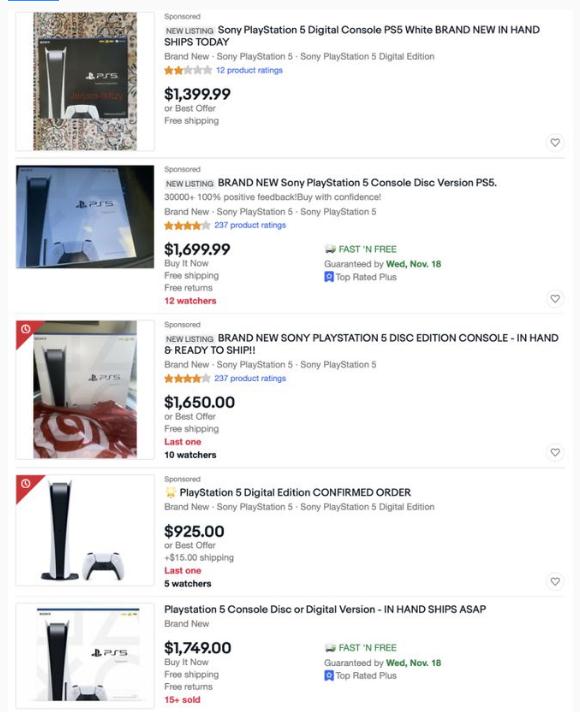所以黃牛們就利用這一點(diǎn)來(lái)賺大錢(qián),他們的價(jià)格是 PS5 零售價(jià)的2-3 倍。下面是 eBay 上 PS5 的價(jià)格: