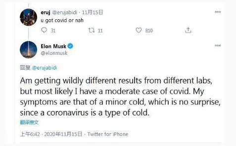 據環(huán)球網(wǎng)北京時(shí)間 11 月 16 日發(fā)布的消息,馬斯克15 日在推特上表示,自己可能是新冠肺炎輕中癥患者。他寫(xiě)道,“我從不同的實(shí)驗室得到了截然不同的結果,但最可能的是我是新冠肺炎輕中癥患者。我的癥狀是輕微感冒,這并不奇怪,因為新冠病毒是感冒的一種。”