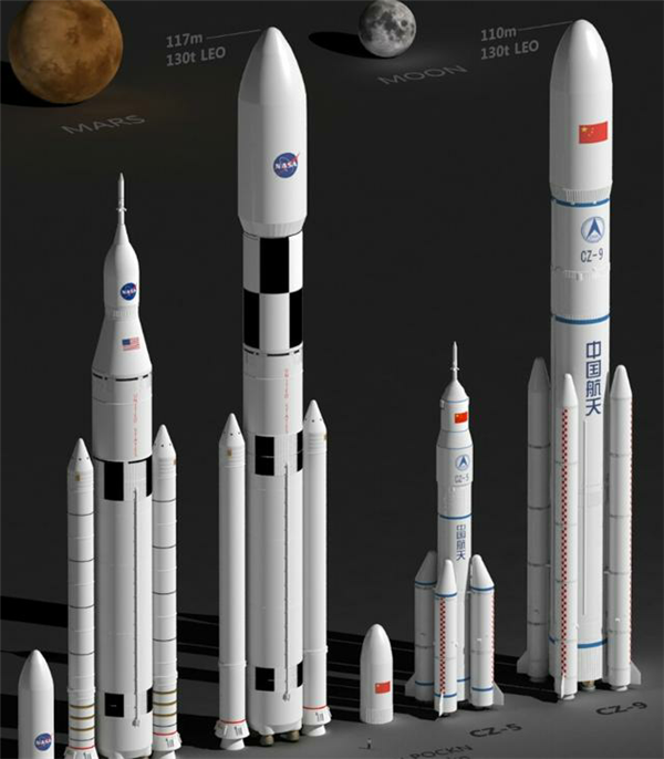 正在規劃的“長(cháng)征九號”火箭(最右)起飛質(zhì)量超過(guò)4000噸,運力和美國“土星五號”火箭大致相當,超過(guò)正在研制的美國下一代運載火箭(SLS),完全可以滿(mǎn)足未來(lái)載人月球探測、火星取樣返回、太陽(yáng)系行星探測等任務(wù)。|Spacenews