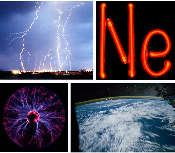 等離子體在自然界中普遍存在。例如圖中的閃電、氖燈、等離子體球、航天飛機上的等離子體蹤跡。|維基百科