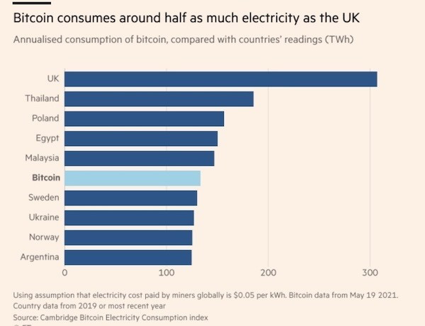 近期,英國《金融時(shí)報》發(fā)表了題為“骯臟的貨幣:日益突出的比特幣能耗問(wèn)題”的專(zhuān)題文章。文中提及,劍橋大學(xué)比特幣耗電量指數(Bitcoin Electricity Consumption index)的最新計算似乎表明,比特幣挖礦每年耗電量為133.68太瓦時(shí)——這一基于最佳猜測的估算數字在過(guò)去5年里不斷上升。這使得比特幣的耗電量略高于瑞典(2020年用電量為131.8太瓦時(shí)),同時(shí)僅次于馬來(lái)西亞(147.21太瓦時(shí))。