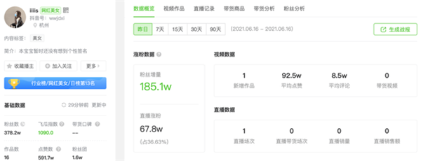 孫一寧抖音賬號“iiiis”6月16日新增粉絲185.1萬(wàn),其中直播漲粉67.8萬(wàn)。截至發(fā)稿,其抖音賬號擁有405萬(wàn)粉絲,且還在快速漲粉。
