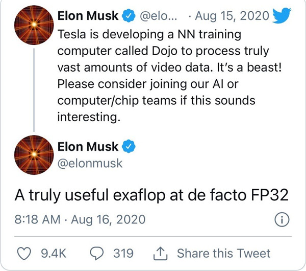 2020年,馬斯克在推特(Twitter)發(fā)文表示,特斯拉的Dojo超級計算機能夠實(shí)現每秒千萬(wàn)億次浮點(diǎn)運算(1000 PFLOPS),這將使得Dojo成為一款真正的尖端超級計算機。馬斯克稱(chēng),特斯拉未來(lái)的Dojo超級計算機算力將要達到每秒鐘exaFLOP(百億億次,是千萬(wàn)億次PFLOPS的1000倍)的級別,并且運算速度要超過(guò)富岳(Fugaku),成為世界第一。