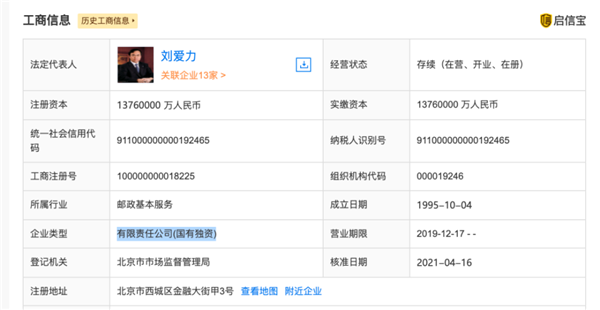 另?yè)⑿艑殧祿@示,中國郵政集團由國務(wù)院100%控股,成立于1995年,注冊資本為1376億元,法人代表是劉愛(ài)力。