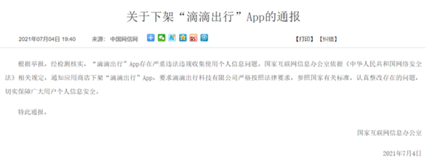 ↑關(guān)于下架“滴滴出行”App的通報截圖