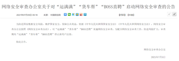 一天后,網(wǎng)絡(luò )安全審查辦公室發(fā)布關(guān)于對“運滿(mǎn)滿(mǎn)”“貨車(chē)幫”“BOSS直聘”啟動(dòng)網(wǎng)絡(luò )安全審查的公告。