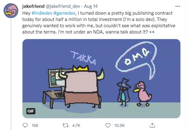 近日,一位 Twitter 名叫 “Jakefriend” 的獨立游戲開(kāi)發(fā)者發(fā)文訴說(shuō)其近期遇到的一件差點(diǎn)鑄成大錯的事情,某個(gè)獨立游戲發(fā)行商向 Jakefriend 提出要投資其手繪風(fēng)動(dòng)作冒險游戲 《Scrabdackle》, 并且出資 50 萬(wàn)加元,但在簽署合同時(shí),他發(fā)現合同不僅可能奪走該游戲的版權,甚至還會(huì )讓其負債終生。