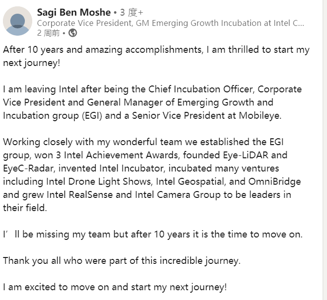 兩周前,英特爾 RealSense 業(yè)務(wù)的負責人薩吉·本·摩西(Sagi Ben Moshe)在領(lǐng)英(LinkedIn,職場(chǎng)社交平臺)表示,他將離開(kāi)工作 10 年的英特爾公司,開(kāi)啟職業(yè)生涯的新篇章。而這份聲明,伴隨著(zhù)昨日 RealSense 業(yè)務(wù)的結束得到了證實(shí)。