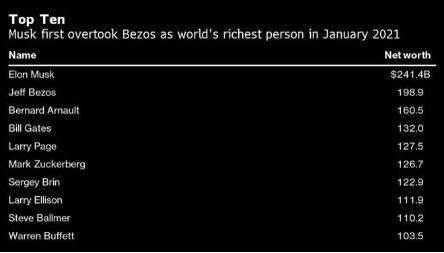馬斯克曾被認為將成為世界上第一位萬(wàn)億美元富翁,但這在很大程度上要歸功于特斯拉的預期股價(jià)表現。去年開(kāi)始的特斯拉熱潮讓馬斯克的凈資產(chǎn)飆升,而且漲勢仍未減弱。僅在周一,馬斯克的凈資產(chǎn)就增加了 66 億美元。