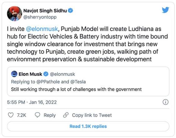 圖示:旁遮普邦官員納夫約特·辛格·西杜(Navjot Singh Sidhu)向馬斯克發(fā)出邀請