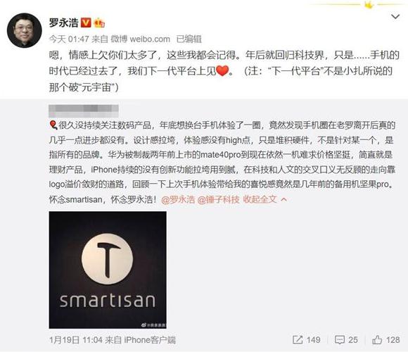 對此,錘子科技 CEO 羅永浩表示,情感上欠你們太多了,這些我都會(huì )記得。年后就回歸科技界,只是手機時(shí)代已經(jīng)過(guò)去了,我們下一代平臺上見(jiàn)。