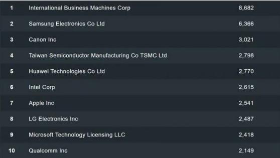 排在蘋(píng)果之前的是英特爾,以 2615 項專(zhuān)利排名第六,華為以 2770 項專(zhuān)利排名第五,蘋(píng)果芯片合作伙伴臺積電以 2798 項專(zhuān)利排名第四。排名第一的是 IBM,擁有 8682 項專(zhuān)利,其次是三星電子,擁有 6366 項專(zhuān)利;佳能排名第三,擁有 3021 項專(zhuān)利。