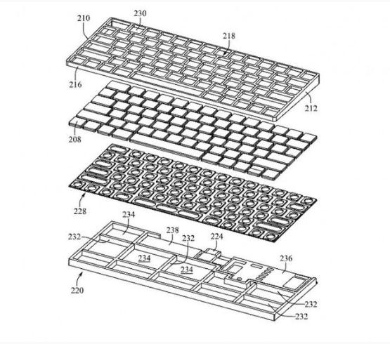 蘋(píng)果在專(zhuān)利申請中表示,對提供高性能便攜式計算設備的強烈需求,推動(dòng)了笨重計算部件的小型化和縮小。處理器、電池、內存、集成電路等部件越來(lái)越小,以提供輕量級和薄型的便攜式計算設備。因此,進(jìn)一步定制外殼設計、形狀和配置,以提供額外的或增強的設備功能是可能的,也是可取的。這確實(shí)是整個(gè)專(zhuān)利申請的主旨,因為其超過(guò) 13 萬(wàn)字的大部分內容是詳細說(shuō)明為這種鍵盤(pán)通風(fēng)以保持部件冷卻的方法。
