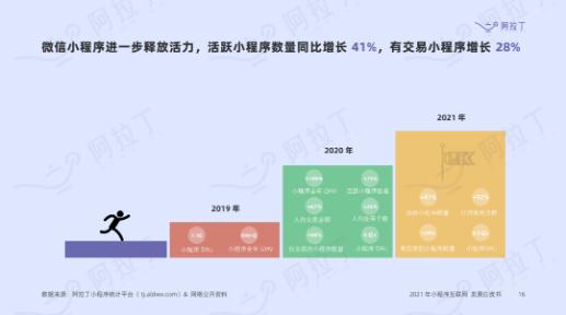 去年,微信小程序的生態(tài)趨于穩步發(fā)展趨勢,生態(tài)能力也在不斷擴建,甚至延伸到微信外,補足更多營(yíng)銷(xiāo)和服務(wù)場(chǎng)景,助力商家實(shí)現交易增長(cháng)。