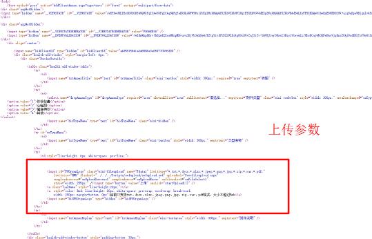 查看網(wǎng)頁(yè)源碼,有點(diǎn)復雜,刪改了幾個(gè)可能影響上傳的參數,還是不能點(diǎn)擊瀏覽,上傳文件