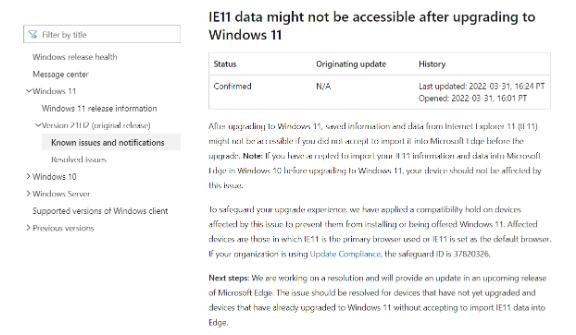 根據微軟官方 Windows 11 Health Dashboard 文檔,微軟為部分 Internet Explorer 用戶(hù)設置了更新模塊,如果用戶(hù)在安裝 Windows 11 之前不接受將瀏覽數據導入 Edge 的提示,升級到 Windows 11 后可能將無(wú)法訪(fǎng)問(wèn) Internet Explorer 的數據。