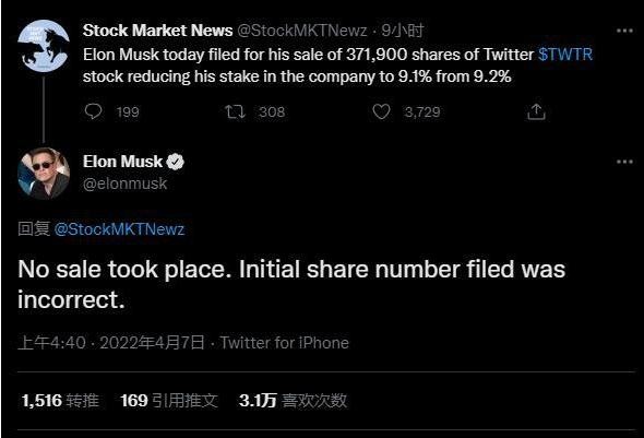 美國當地時(shí)間周三,特斯拉首席執行官埃隆·馬斯克(Elon Musk)駁斥了有關(guān)他減持推特股份的傳聞,并稱(chēng)有關(guān)其持有推特股份的初步監管文件中包含了錯誤的持股數量。