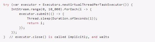 開(kāi)發(fā)者可以選擇使用虛擬線(xiàn)程還是平臺線(xiàn)程,但虛擬線(xiàn)程在高吞吐量的服務(wù)器應用程序中表現更好。比如下面這段休眠一秒鐘的代碼就創(chuàng )建了大量的虛擬線(xiàn)程,程序首先獲得一個(gè) ExecutorService,它為每個(gè)提交的任務(wù)創(chuàng )建一個(gè)新的虛擬線(xiàn)程,然后提交 10000 個(gè)任務(wù)并等待所有任務(wù)完成: