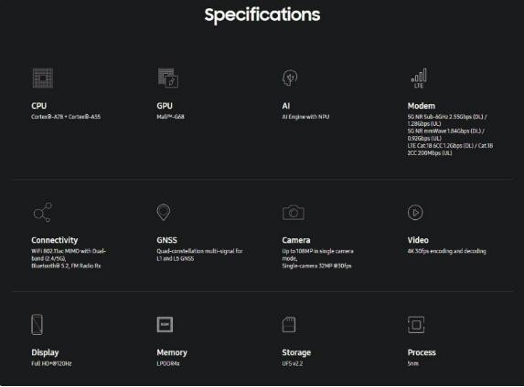 簡(jiǎn)單來(lái)說(shuō),該芯片基于三星的 5nm EUV 工藝打造,八核 CPU 設計,由兩個(gè) Cortex-A78 性能內核和六個(gè) Cortex-A55 效能內核組成,GPU 則是公版 Arm Mali-G68,支持 sub-6GHz 和 mmWave 5G 連接。