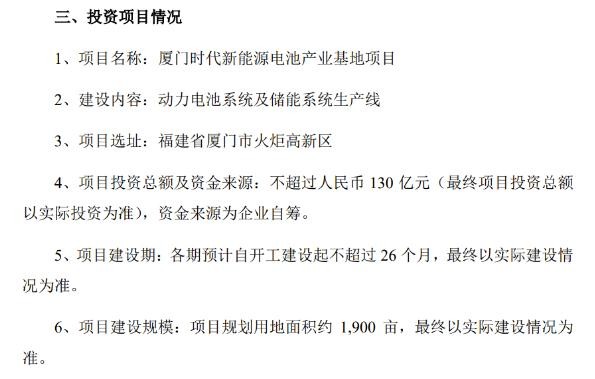 公告顯示,廈門(mén)時(shí)代新能源電池產(chǎn)業(yè)基地項目建設內容為動(dòng)力電池系統及儲能系統生產(chǎn)線(xiàn),項目選址為福建省廈門(mén)市火炬高新區,各期預計自開(kāi)工建設起不超過(guò) 26 個(gè)月,項目規劃用地面積約 1900 畝。