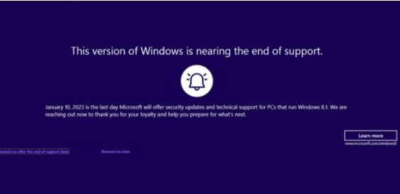 據相關(guān)用戶(hù)反饋,已經(jīng)收到微軟推送的彈窗警告,提醒官方對 Windows 8.1 系統的安全補丁和技術(shù)支持將在 2023 年 1 月 10 日結束。微軟給了用戶(hù)三個(gè)選擇,可以選擇了解更多信息、稍后提醒或在結束支持時(shí)提醒。